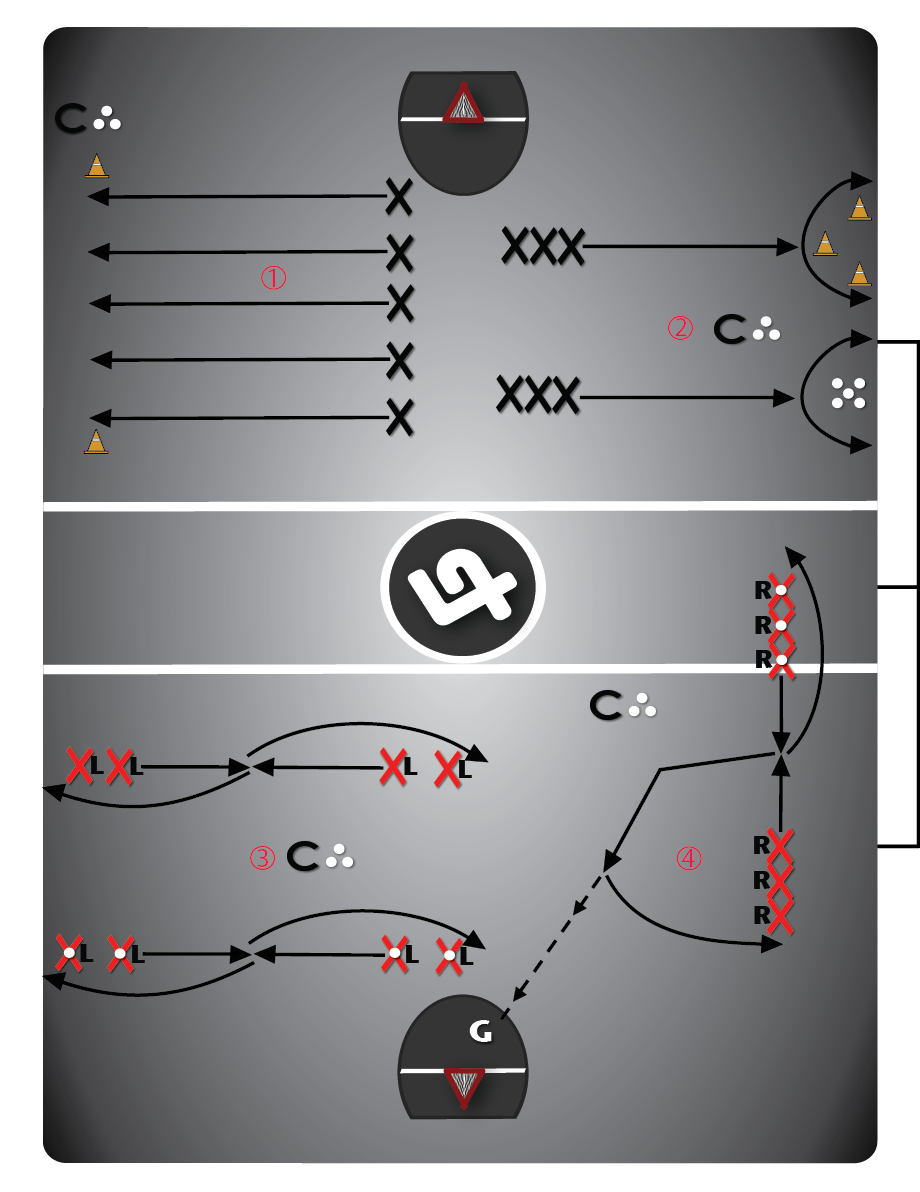 První hráč doběhne ke kuželu na vrcholu, zpevní se a cvalem bokem půlkruhem běží k jednomu bočnímu kuželu, poté ke druhému (napodobuje pohyb ve skrumáži při sbírání volného míče) a nakonec vysprintuje z prostoru (varianta 2A). Hráči během cvičení střídají stranu, na kterou začínají cval.