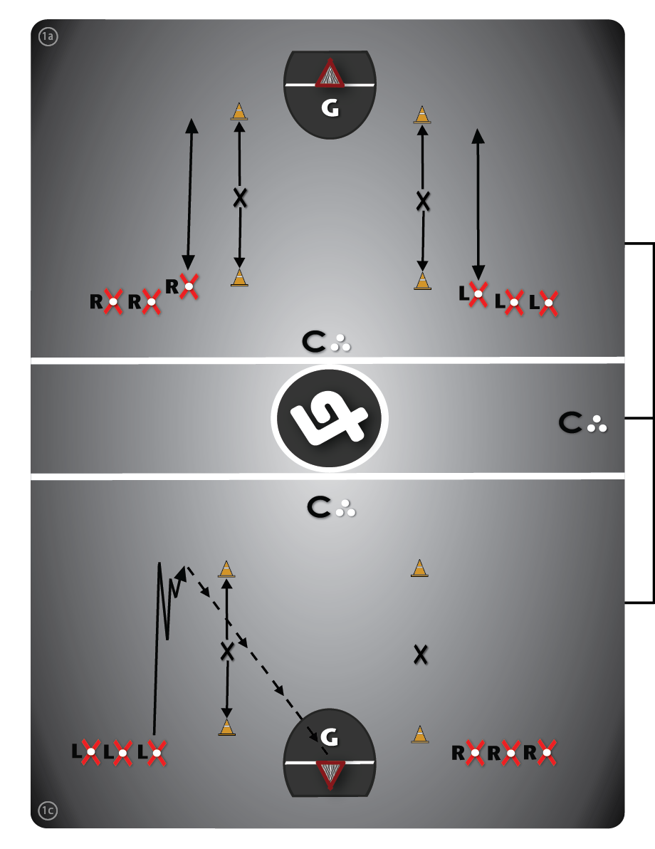 Po asi 5 sekundách stínování trenér zapíská podruhé, což značí, že útočník může jít na branku jeden na jednoho; současně s tím začíná cvičení druhá strana.