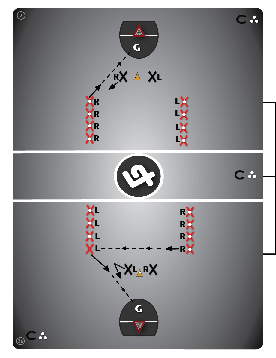 - Rozdělte hráče na pravoruké a levoruké a každou skupinu postavte v zástupu na pozici střelce na jejich správné straně hrací plochy. Mezi čelem každého zástupu a brankou stojí stejnoruký obránce pánví k mantinelu. Všichni hráči v zástupech mají míč.