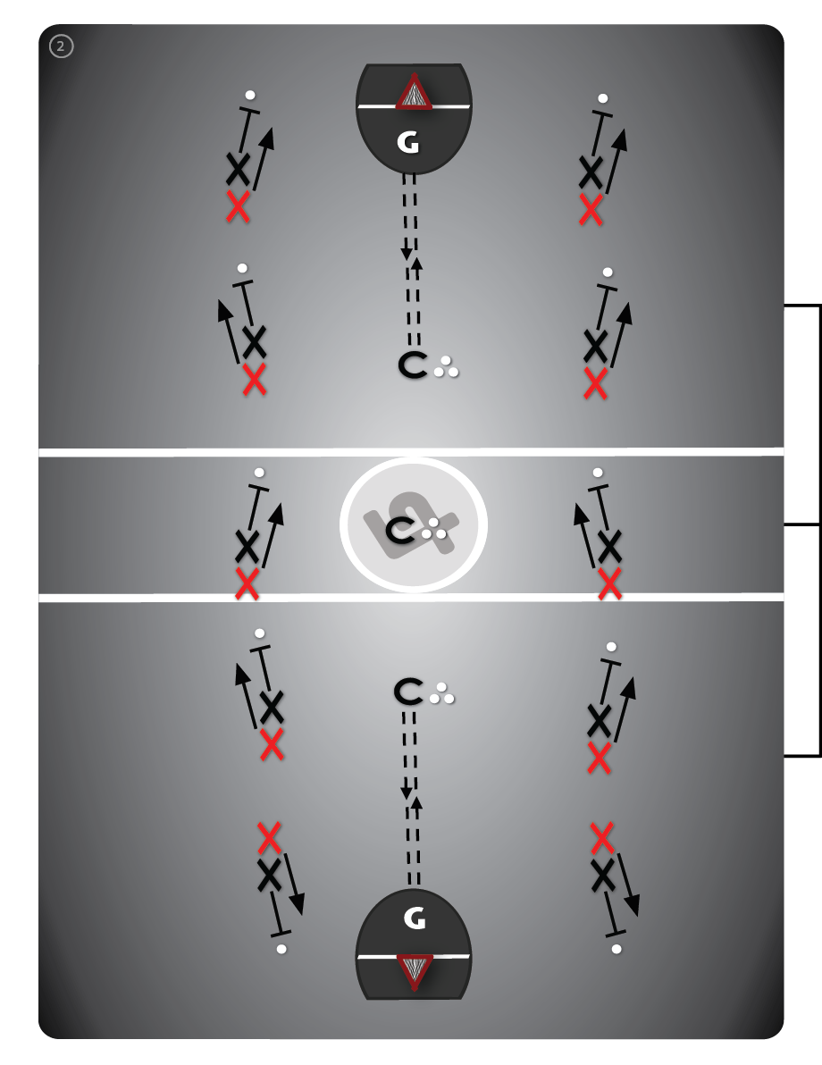 - Cvičení končí na písknutí (10 až 20 sekund). Hráči ve dvojicích si prohodí pozice.
