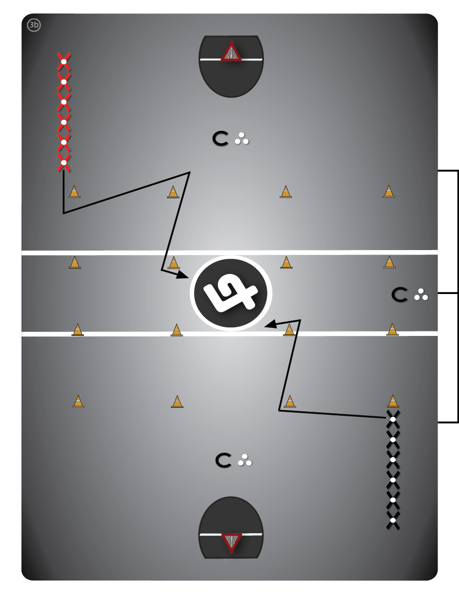 - *Varianta 1A (5 min): bez míčů Hráči se seřadí u kteréhokoliv rohu čtverce, jsou bez míčů. Nejprve běhají po jednom (každý jednou). U každého kužele změní směr a po vyběhnutí ze čtverce se zařadí na konec jiného zástupu. Poté běhají klusem ve skupině za vodičem cikcak, přičemž se drží co nejtěsněji za sebou (holí se dotýkají hráče před sebou). Vždy po 20 až 30 sekundách nebo na signál trenéra střídejte běh popředu, běh cvalem stranou a běh pozpátku.