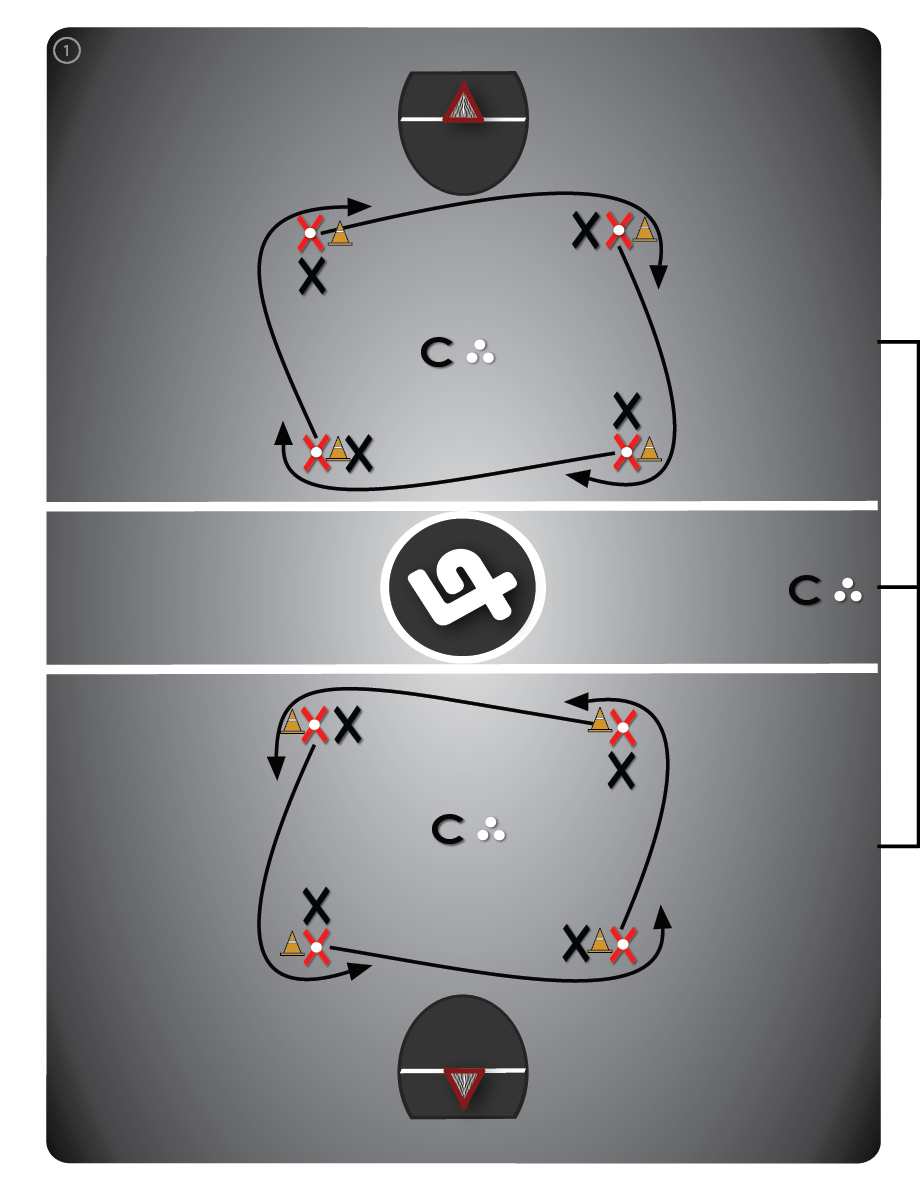 - *Varianta 1 (5 min): závod s míčem Hráči vnějškem obíhají čtverec zpět do svého zástupu, na signál trenéra se mění směr (ve směru a proti směru pohybu hodinových ručiček).