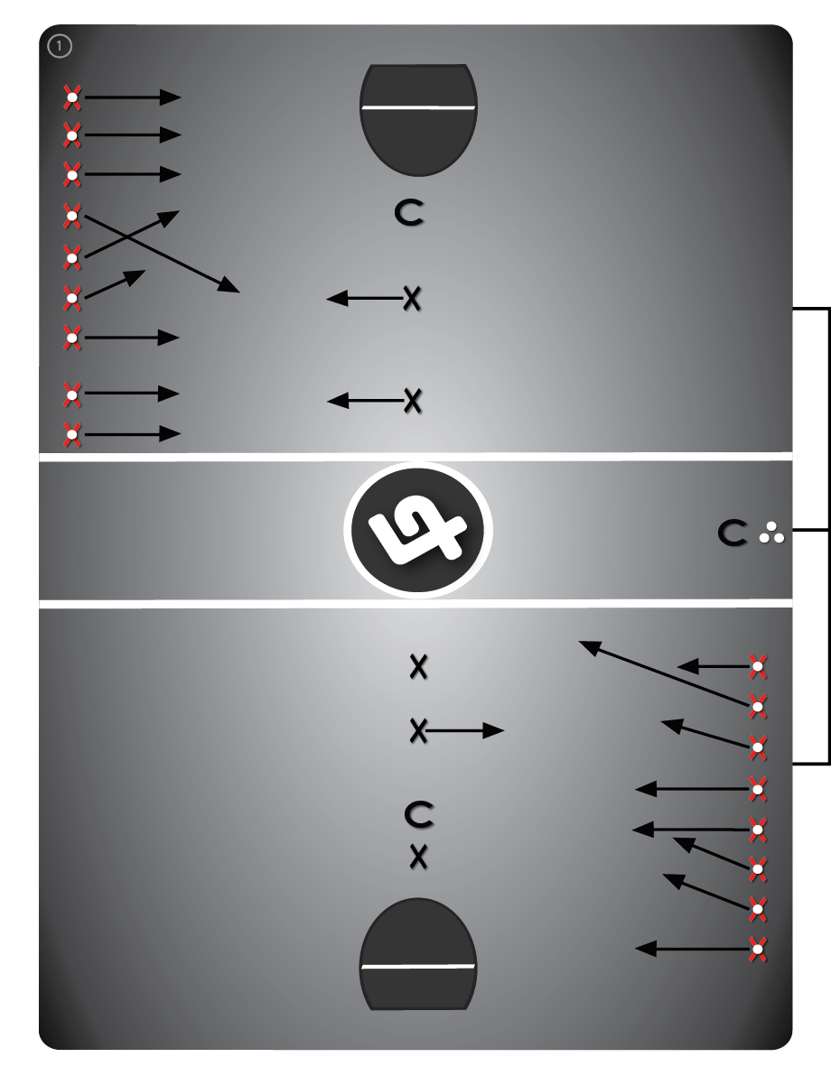 Je-li hráč vyřazen, odejde na střídačku nebo mimo neutrální území. V cvičení se střídají dva různí obránci (buď po každém opakování, nebo po každé sérii).