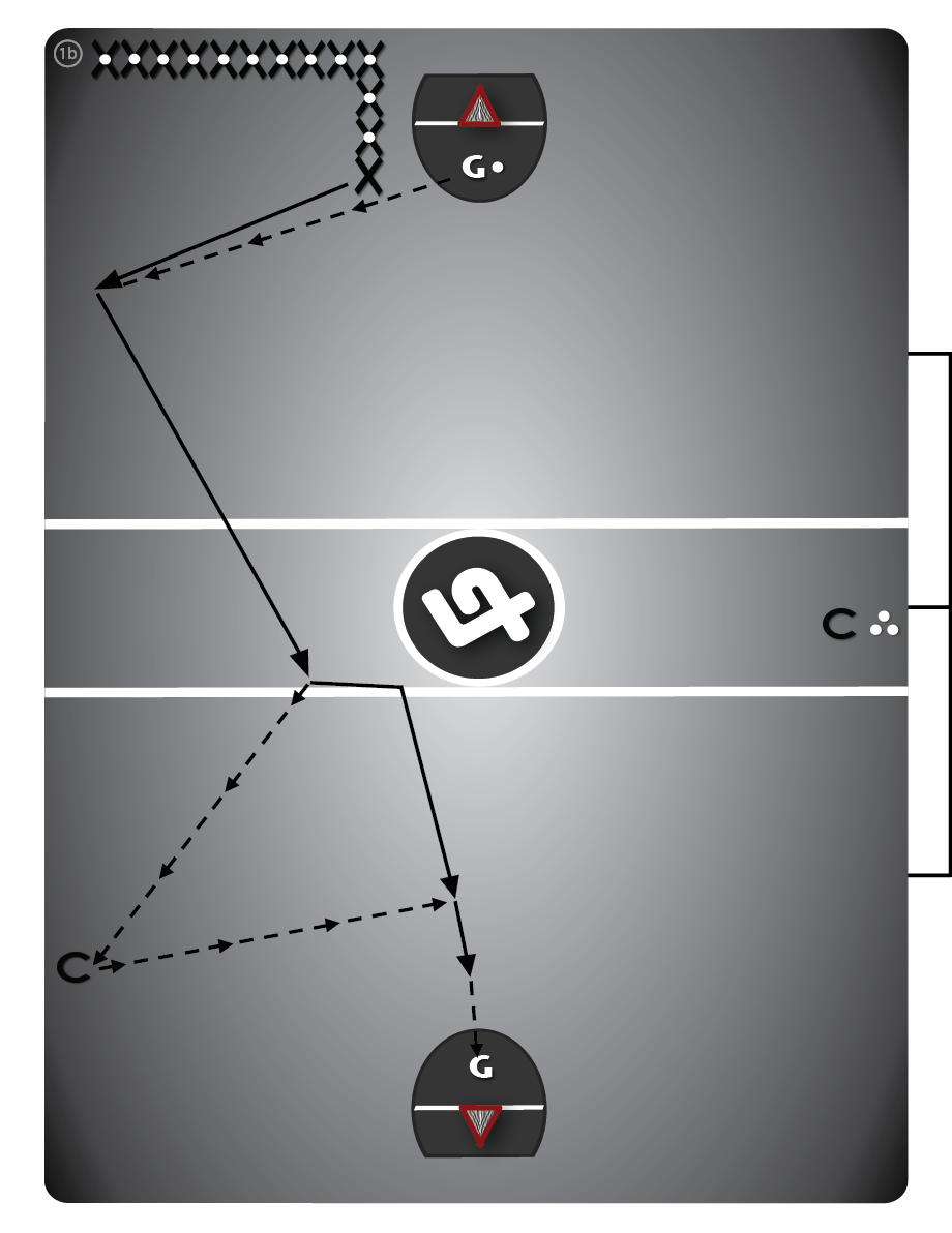 - Hráč po zpracování přihrávky (i pokud míč nechytne) pokračuje buď kolem trenéra (krytí míče), který stojí přibližně ve středu hrací plochy (varianta 1A, 7 min), nebo si s trenérem stojícím v polovině útočného území (varianta 1B, 7 min) vymění přihrávku v úniku směrem na druhou branku.