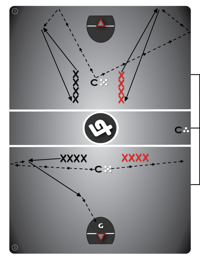 Varianta 3 (7 min): sbírání po směru Stejné jako předchozí, trenéři ale posílají míč od hráčů směrem do středu hrací plochy tak, aby jej hráč dokázal sebrat ještě před brankovištěm a musel zakončovat rychle a zblízka.