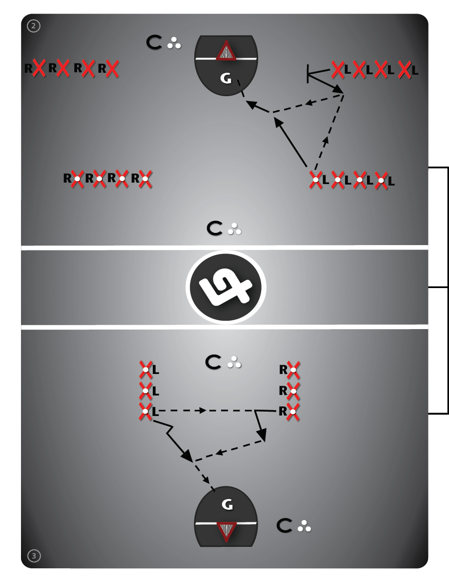 - Hráči jsou v zástupech na pozicích střelce na své správné straně na obou stranách hrací plochy s míči; cvičení lze provádět na jedné nebo na obou polovinách hrací plochy. Na pozicích křídla jsou trenéři.