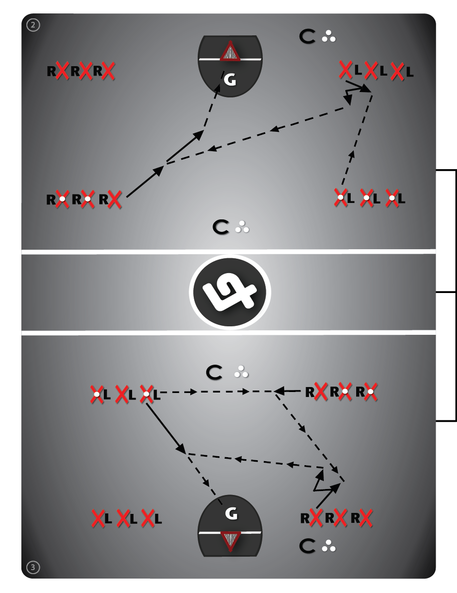 - Hráči jsou v zástupech na pozicích křídla a střelce na své správné straně na obou stranách hrací plochy. Cvičení lze dle počtu hráčů provádět na jedné nebo na obou polovinách hrací plochy.