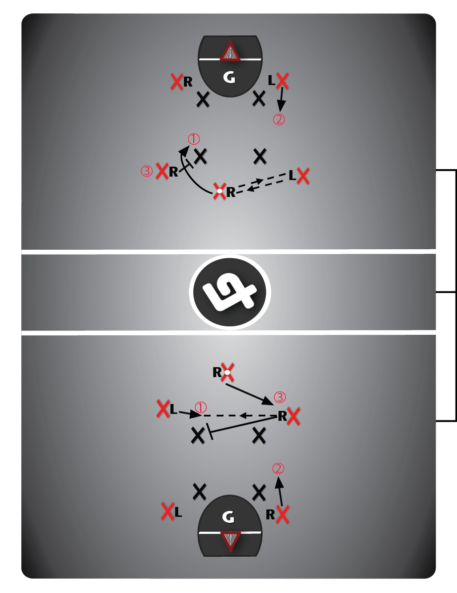 - The point player continues dragging behind the seal for a seam shot (Option #1), or at any time skip passes to the far-side crease player who moves up to the soft spot (Option #2).