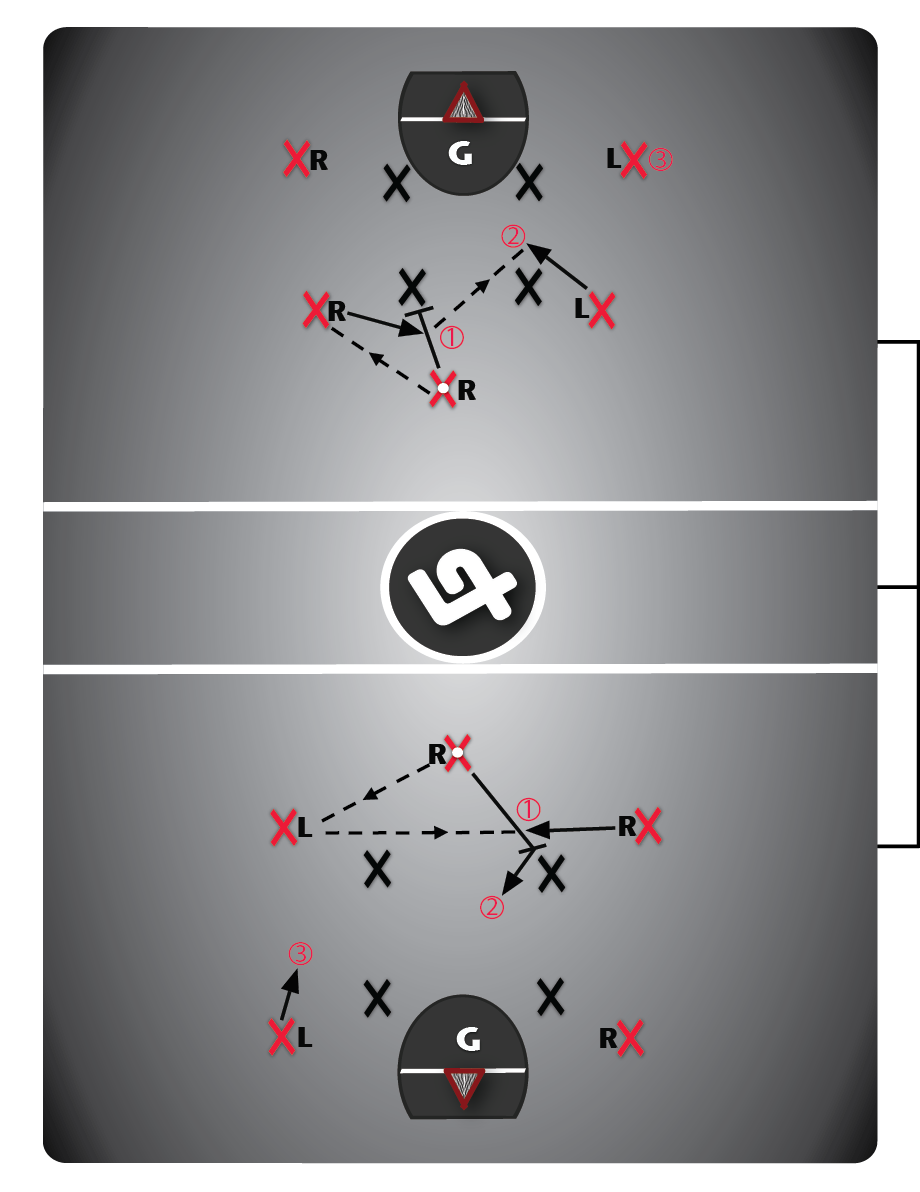 - The point player passes to the opposite-handed shooter (who can also pass to the same-side crease player), which initiates the play.