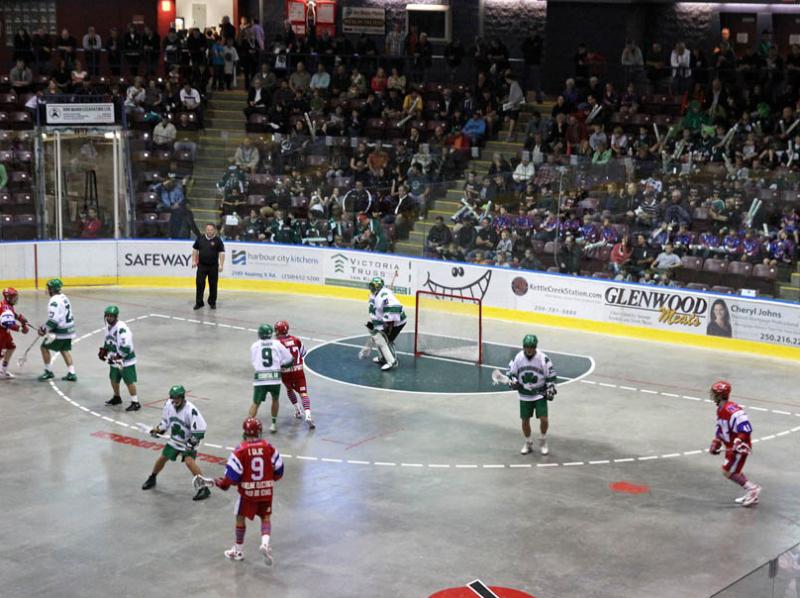 Usually when a team pulls their goalie, the opposing team will “bang sticks” to alert their teammates to switch into a Basic “House” Defense, or box. Teams will usually either set up in 1-2-1-2 (balanced floor) or a 3-3 (middle clear) formation, but a 4-2 is also sometimes used. Set-plays usually start with no passes “around the horn” and with 8 seconds left on the game clock in order to avoid “empty net” goals against (unless running a sneak).