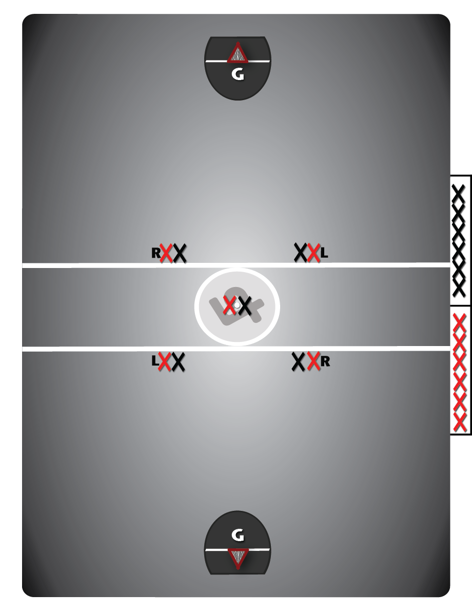 - This is a basic offensively oriented face-off set up, with 2 defenders on the defensive restraining line and two offensive players on the offensive side restraining line; all players having a set responsibility.