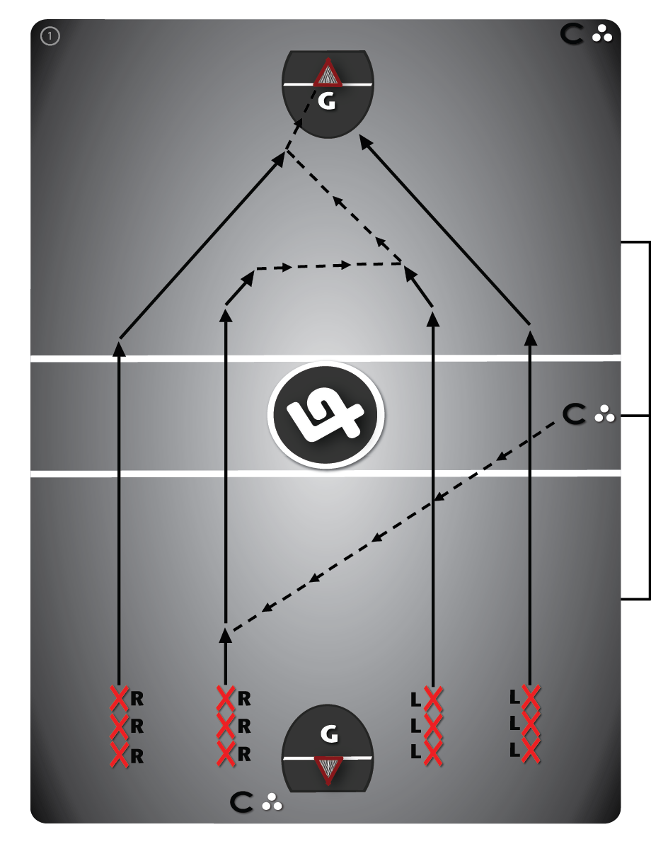 - *Varianta 1 (7 min): 4 koridory najednou Na jednom konci hrací plochy vytvořte čtyři zástupy s rovnoměrnými rozestupy na šířku hrací plochy. Hráči jsou na svých správných stranách bez míčů. Lze také začínat až na čáře území.