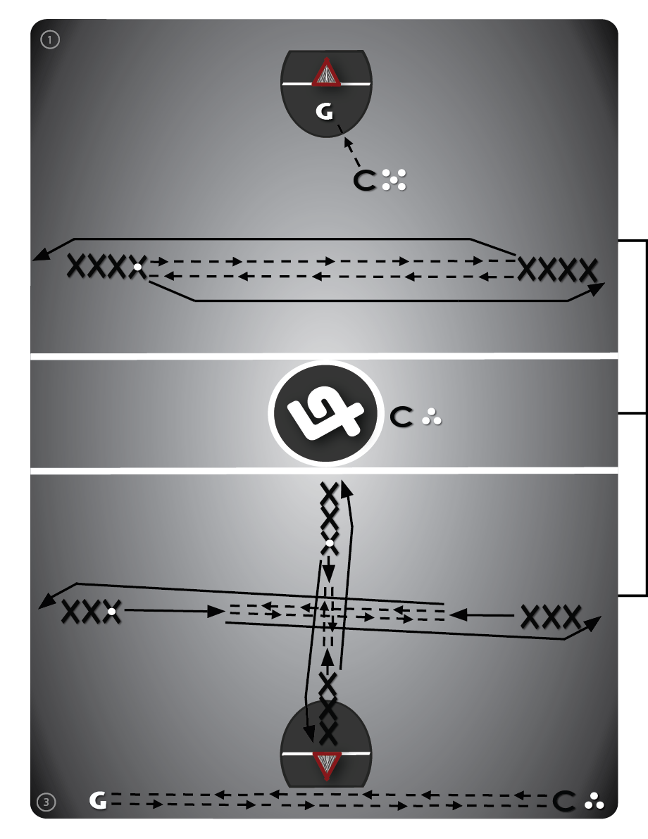 - Vytvořte dva zástupy čelem proti sobě ve vzdálenosti asi 15 metrů přibližně na pozici střelce (lze i na délku hrací plochy, kdy jsou zástupy od sebe dále – vyšší kardio efekt).